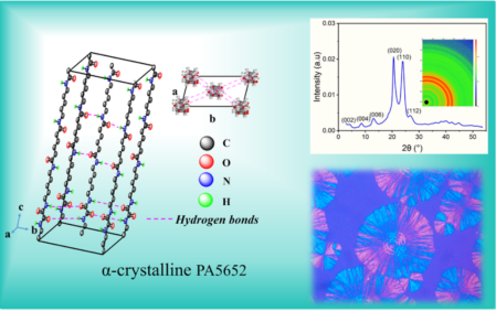 貴大新聞網(wǎng)訊(材料與冶金學(xué)院)近日,我校材料與冶金學(xué)院劉玉飛特聘教授團(tuán)隊在生物基聚酰胺材料研究領(lǐng)域取得重要突破,相關(guān)成果以 Biobased Polyamide 5652 with α?Crystal Form: Characterization and Low Moisture Absorption為題,發(fā)表于高分子領(lǐng)域頂級期刊Macromolecules(自然指數(shù)期刊,中科院一區(qū)TOP)。貴州大學(xué)材料與冶金學(xué)院為論文第一完成單位,材料與冶金學(xué)院2022級碩士研究生王艷平為第一作者,劉玉飛特聘教授為通訊作者。近年來,生物基聚酰胺56(PA56)因其原料可再生、低碳環(huán)保而備受關(guān)注,但其特殊的分子結(jié)構(gòu)(戊二胺單元含奇數(shù)碳原子)導(dǎo)致其晶體通常以γ晶型為主,飽和吸水率高達(dá)12%以上,在潮濕環(huán)境中力學(xué)性能顯著下降(如拉伸強(qiáng)度降低20%-30%),嚴(yán)重限制了在精密工程領(lǐng)域的應(yīng)用,而傳統(tǒng)改性方法往往以犧牲材料其他性能為代價。針對這一難題,劉玉飛特聘教授創(chuàng)新性地提出了雙氫鍵結(jié)構(gòu)調(diào)控策略:自主合成關(guān)鍵單體,設(shè)計并成功合成新型565二胺單體(C16H34N4O2),將565二胺與草酸二丁酯通過溶液聚合及